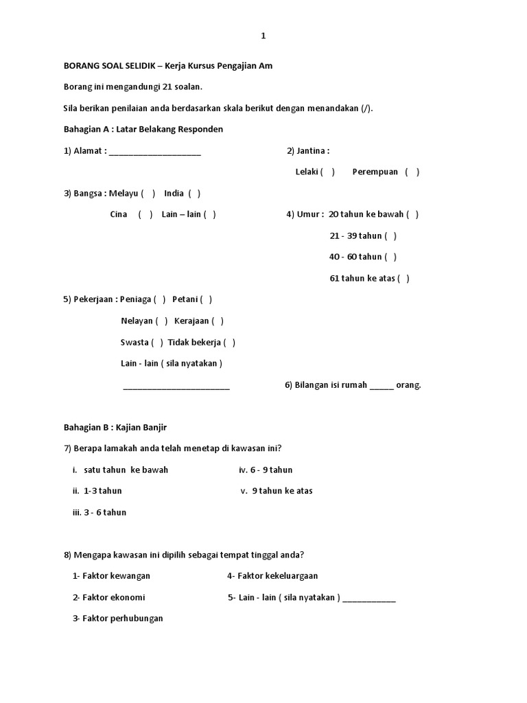 Doc borang soal selidik kerja kursus pengajian am kod mata pelajaran 900 4 bahagian a data demografi. Untuk memaparkan status cuaca semasa serta memantau kejadian banjir di negeri Sarawak 2. Borang soal selidik terbahagi kepada empat bahagian iaitu profil responden pengetahuan kesan dan tindakan responden terhadap isu pencemaran Sungai Pinang.